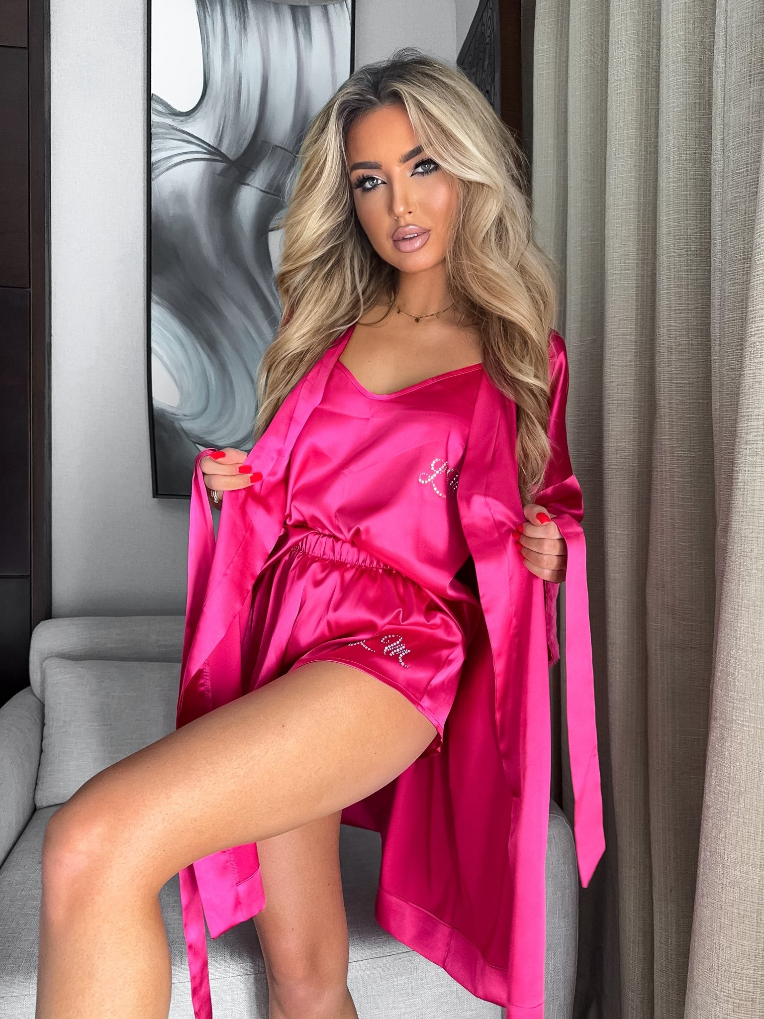 Ein Set aus Morgenmantel & Pyjama (Top und Shorts) - gemacht für Frauen, die Klasse und Komfort in ihrer schönsten Form lieben.